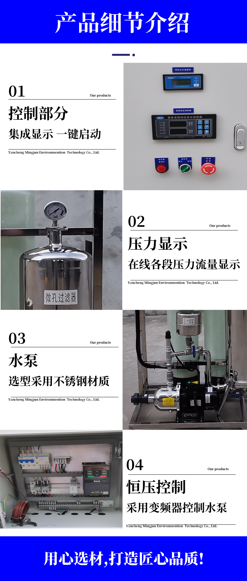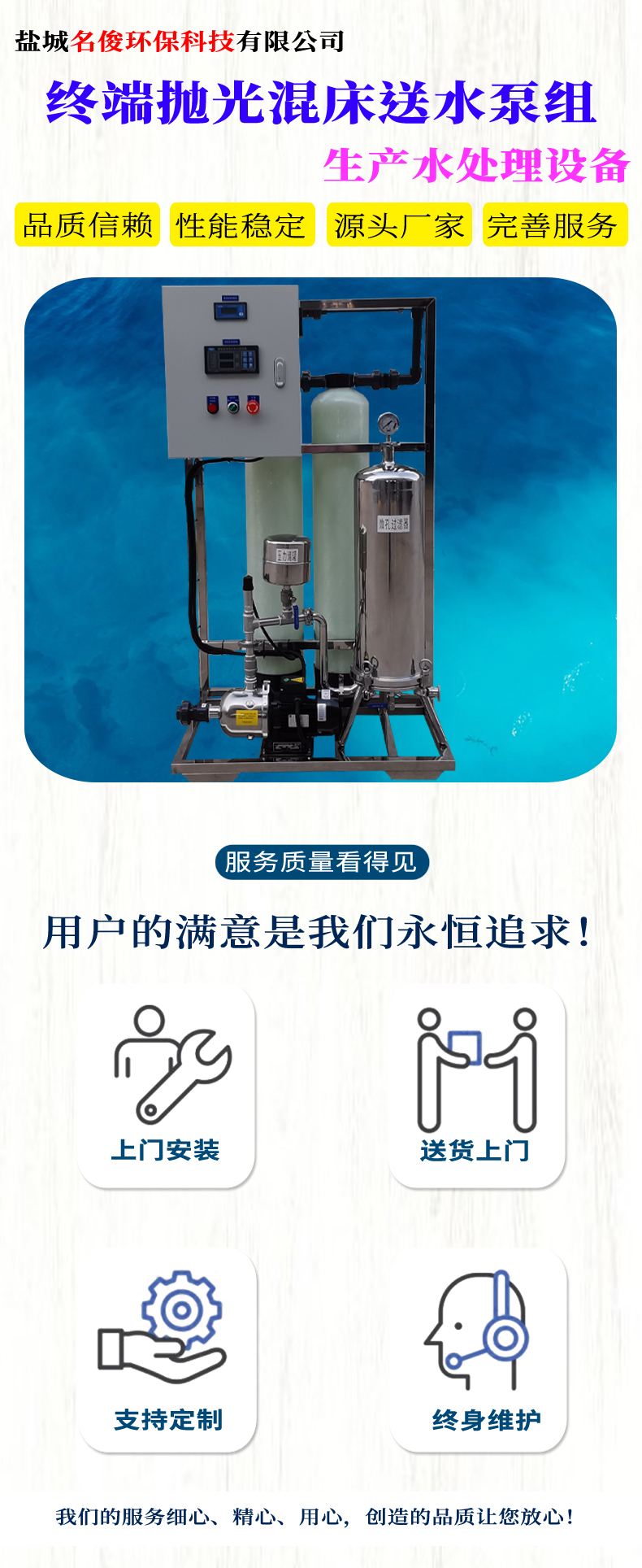名俊源超純水終端拋光混床送水設(shè)備有利于控制出水水質(zhì)穩(wěn)定性,再用0.22微米的微孔過濾器器,有效攔截拋光混床破損的樹脂顆粒及大部分的細(xì)菌。本套終端拋光混床供水采用變頻恒壓方式供水,有效穩(wěn)定供水壓。歡迎登陸網(wǎng)站查詢更多水處理設(shè)備信息:http://m.qiangpiao100.cn/鹽城名俊環(huán)保科技有限公司主營:反滲透純水設(shè)備,純化水